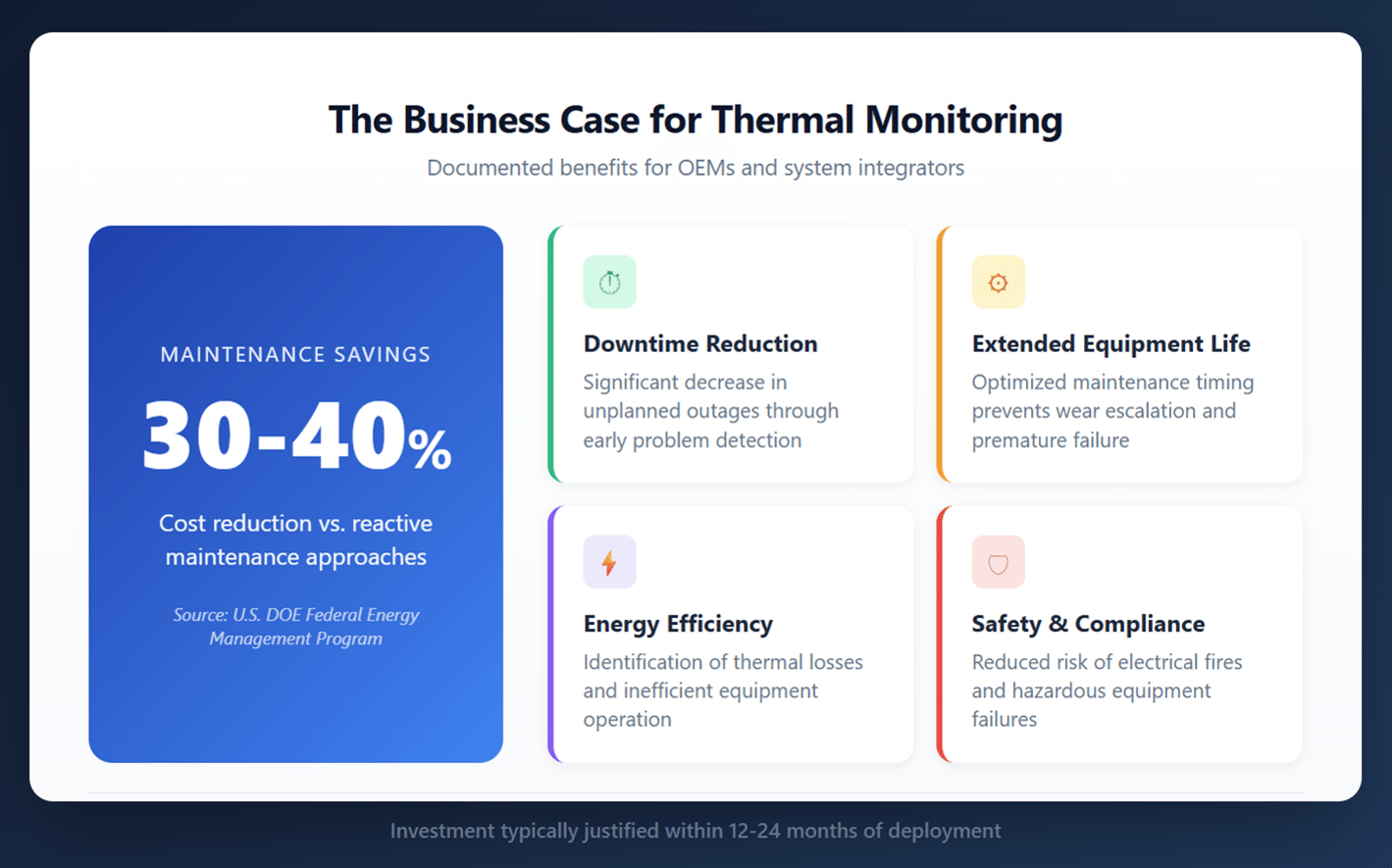 - Predictive maintenance programs using thermal monitoring deliver 30-40% cost savings compared to reactive maintenance approaches