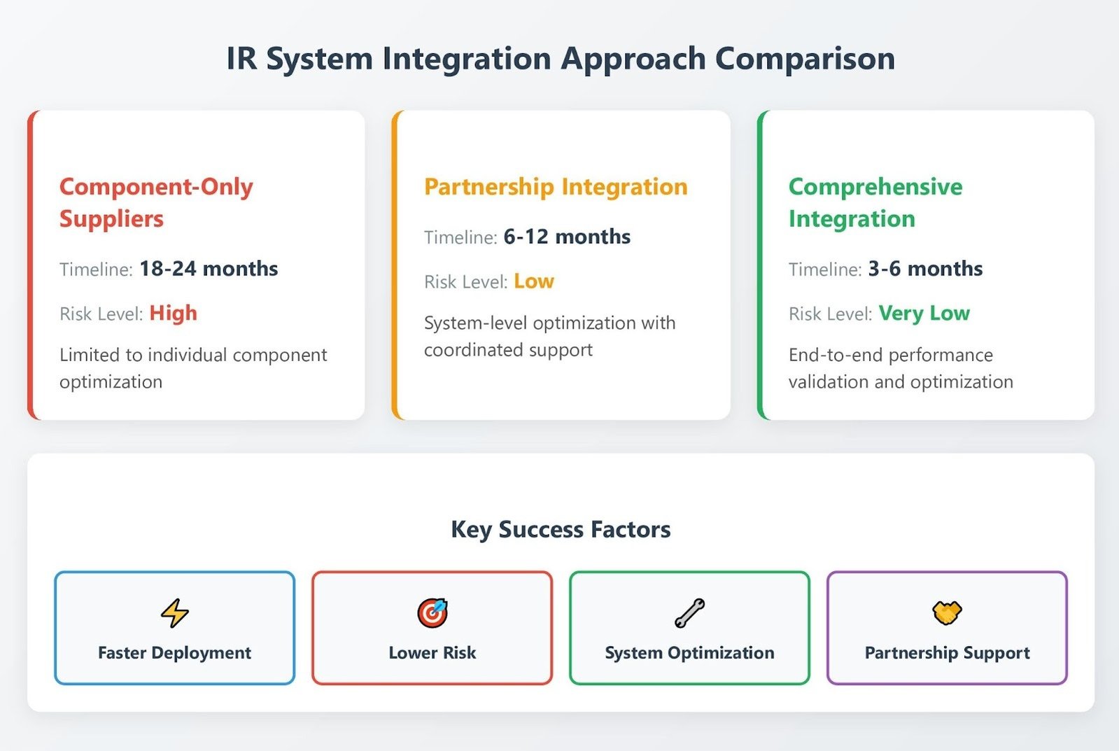 What is the typical timeline for IR system integration projects? With an experienced integration partner, standard IR system integration projects typically require 6-9 months from requirements definition to deployment. Complex custom applications may require 6-12 months, while component-only approaches often extend to 18-24 months due to coordination complexity and interface challenges.