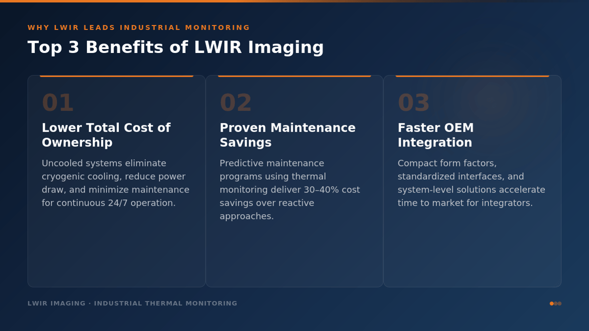 - Uncooled LWIR systems deliver reliable ambient-temperature detection with lower total cost of ownership, making them the natural fit for continuous industrial monitoring.
