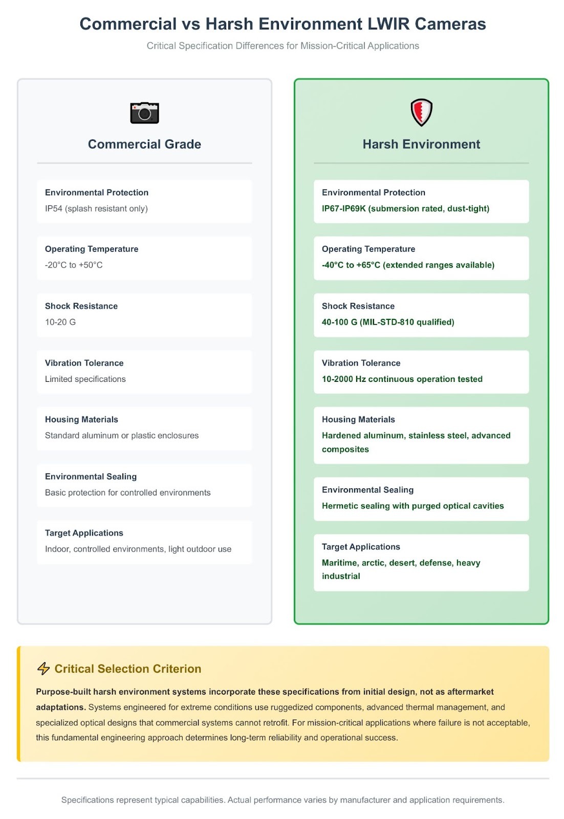 Harsh environment suitability requires purpose-built construction including sealed housings rated IP67 or higher, corrosion-resistant materials, extended operating temperature ranges from -40°C to +65°C or beyond, shock and vibration resistance meeting military standards, and thermal management systems that maintain performance across environmental extremes. Commercial-grade thermal cameras adapted for outdoor use typically fail to meet these requirements.