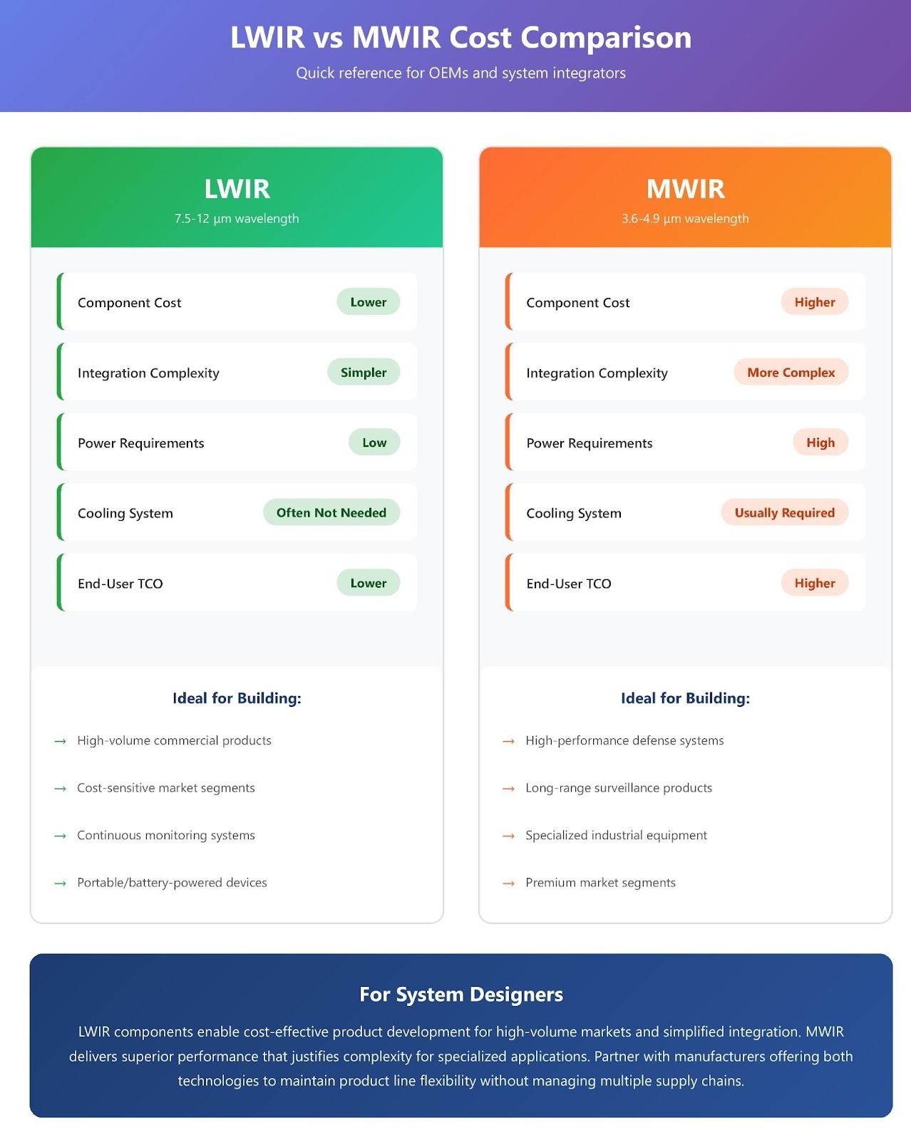 Evaluate total cost of ownership across expected system lifetimes for both your development process and your customers' deployment scenarios. While MWIR offers performance advantages in specific scenarios, LWIR's lower operational costs can enable your customers' broader deployment or allow their budget allocation to other capabilities.